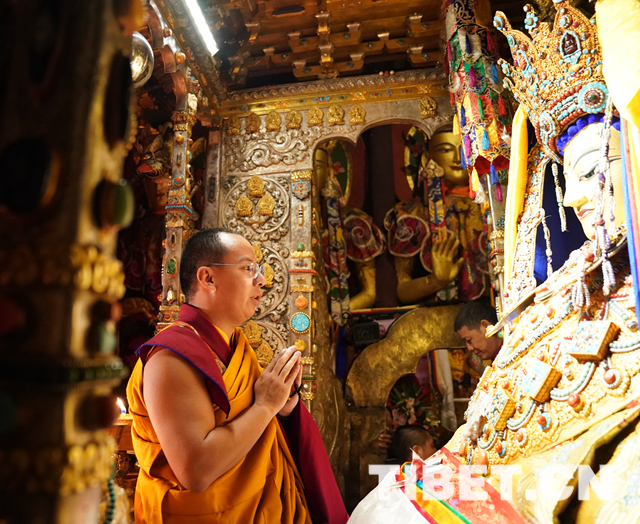 十一世班禪來到釋迦牟尼佛像前,虔誠而莊重地向釋迦牟尼十二歲等身佛像叩頭朝拜,並念誦經文。隨後,十一世班禪手持哈達徐徐走到釋迦牟尼佛像前,雙手合十祈福,向佛像敬獻哈達,並為(wei) 佛像麵部塗繪金粉。