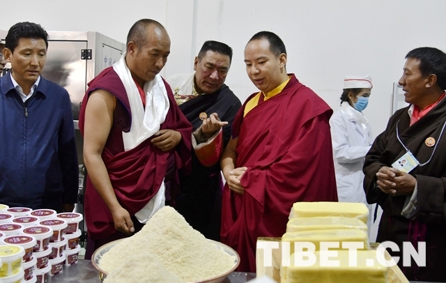 在雪林斯布牧場專(zhuan) 業(ye) 合作社考察調研過程中,十一世班禪通過參觀宣傳(chuan) 展板、聽取相關(guan) 負責人匯報、參觀乳製品加工廠房等,詳細了解合作社的生產(chan) 管理及運營。每到一處宣傳(chuan) 展板前,十一世班禪都停留片刻,仔細聆聽相關(guan) 負責人的介紹,並針對一些細節問題進行詳細詢問。在參觀乳製品加工廠時,十一世班禪對車間裏擺放的酥油筒產(chan) 生了濃厚的興(xing) 趣,饒有興(xing) 致地手握長柄活塞,打起了酥油。看到乳製品加工廠裏生產(chan) 出的犛牛奶渣、酥油和酸奶,十一世班禪還品嚐了奶渣。