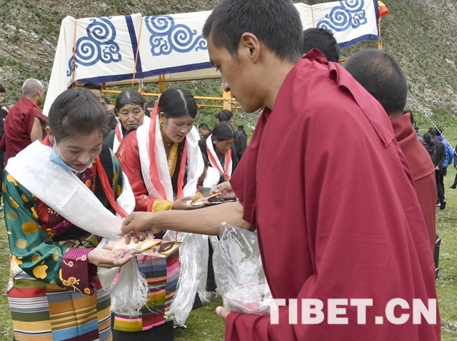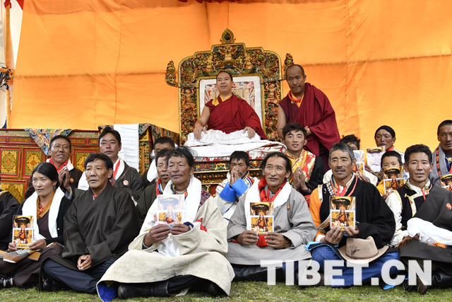圖為(wei) 信教群眾(zhong) 領取十一世班禪的畫像、像章以及紅色金剛結。攝影:王淑
