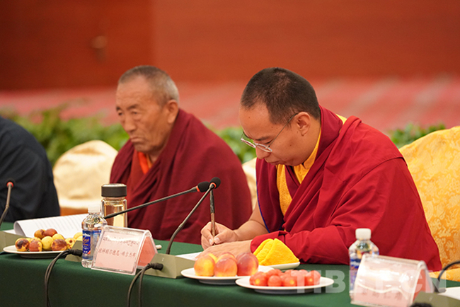 圖為(wei) 十一世班禪認真聆聽山南市宗教界代表人士發言,並不時記錄。攝影:王淑
