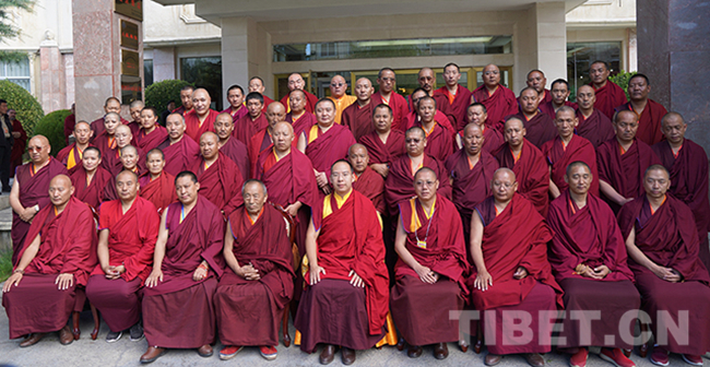 圖為(wei) 十一世班禪與(yu) 參加座談會(hui) 的山南市宗教界代表人士合影。攝影:王淑