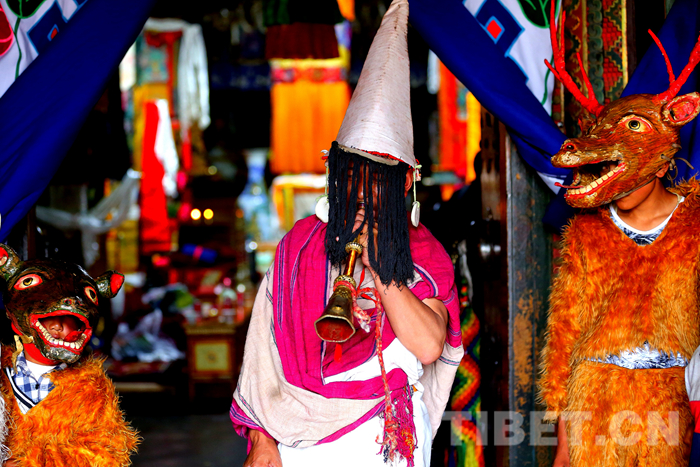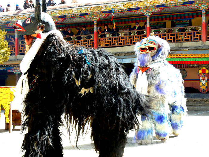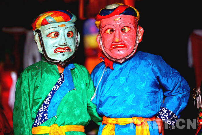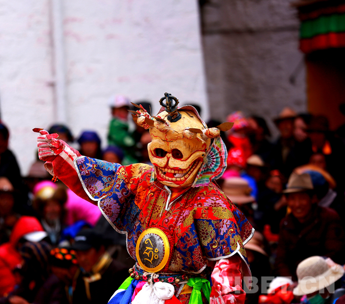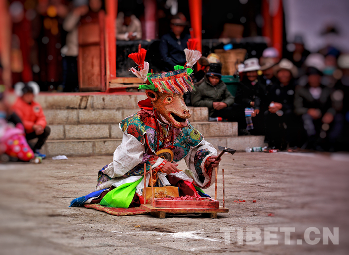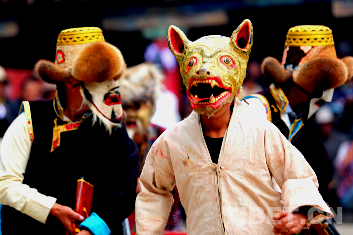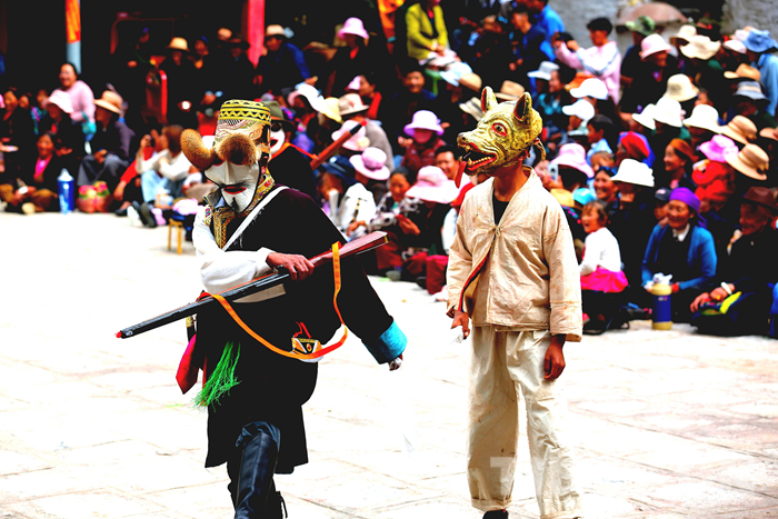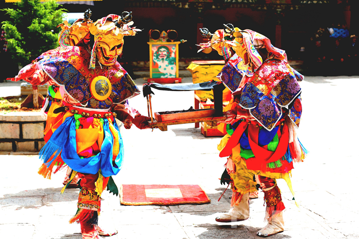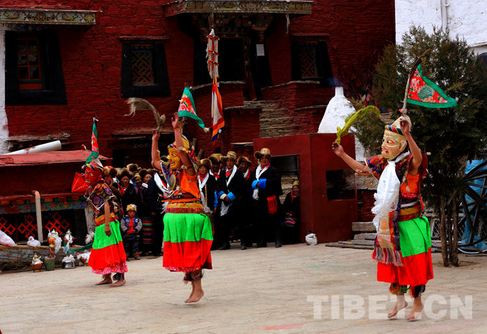 “羌姆”為(wei) 藏語,“法舞”之意,指舞者戴上具有佛教象征意義(yi) 的麵具,在法器的節拍下直接演示佛教教義(yi) 的舞蹈,也稱為(wei) 佛教的“跳神”。“羌姆”是藏傳(chuan) 佛教特有的密宗儀(yi) 軌和藝術形式,是藏區苯教祭祀巫舞、藏族民間舞蹈和印度金剛舞結合而成生的一種宗教藝術形式。