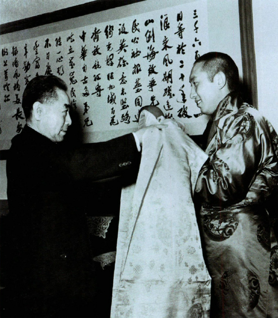 圖為(wei) 十世班禪額爾德尼向周總理敬獻哈達。攝影:金持元