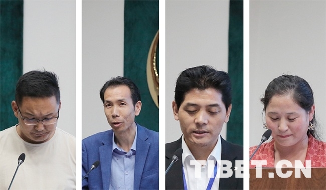 閉幕會(hui) 上,(從(cong) 左至右)藏學基礎研究組的倫(lun) 珠堅參、現實問題研究組的旦正加、藏醫藥研究組的尕藏校郎、語言文化研究組的華毛加等四位青年學者,代表各自組別發言,總結兩(liang) 天會(hui) 期中所在組別的研討內(nei) 容,分享交流感受。