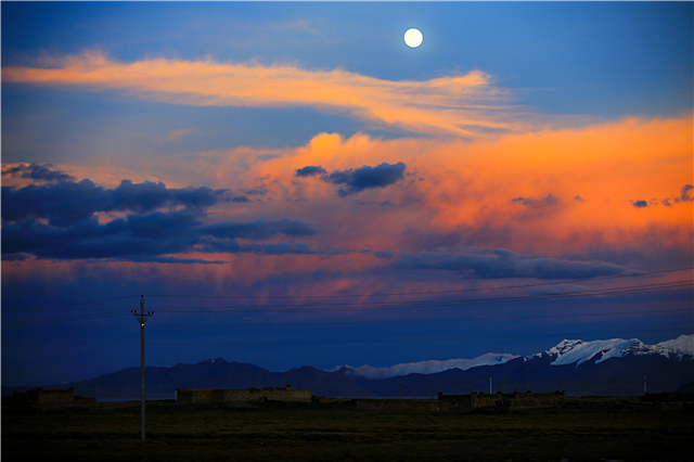 圖為(wei) 中秋那天,普瑪江塘的月亮映襯著晚霞,照亮了整個(ge) 普瑪江塘 攝影:何宇恒