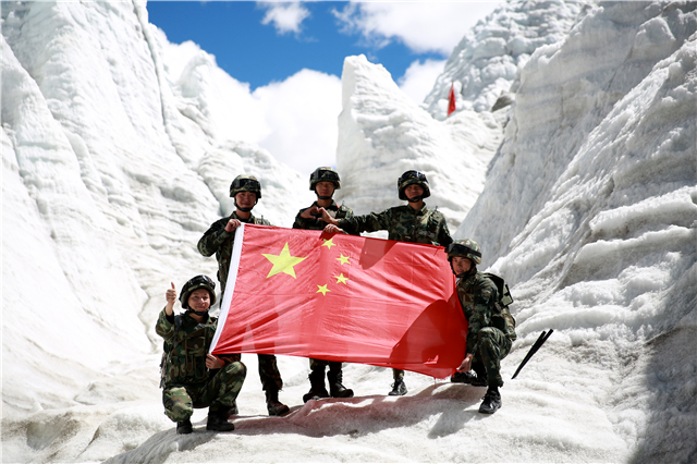 圖為(wei) 普瑪江塘邊防官兵每次完成冰川巡邏任務都要展開國旗,留一張合影。攝影:何宇恒