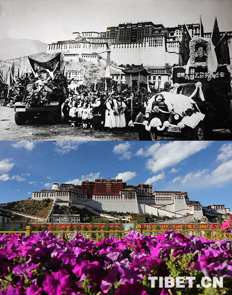 上圖:1954年12月,舉(ju) 世聞名的康藏、青藏公路全線勝利通車到拉薩。圖片來源:《西藏自治區畫集》 下圖:布達拉宮前花團錦簇。攝影:王淑