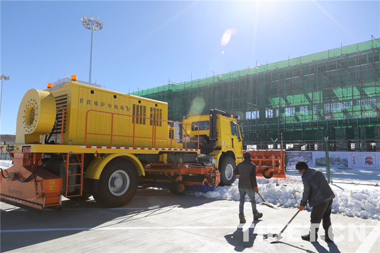 圖為(wei) 工人在鏟除停機坪區域的積雪。