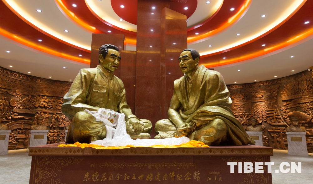 圖為(wei) 紀念館中朱德總司令與(yu) 五世格達活佛雕像。