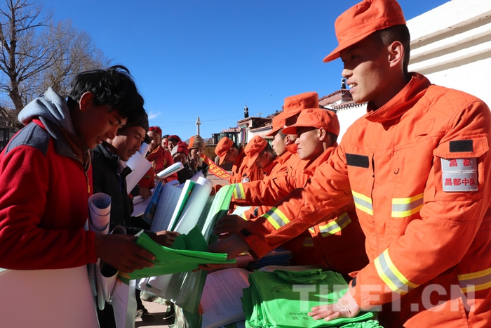 圖為(wei) 在昌都市芒康縣,森林消防員向當地群眾(zhong) 發放防火宣傳(chuan) 品。張洪祥攝