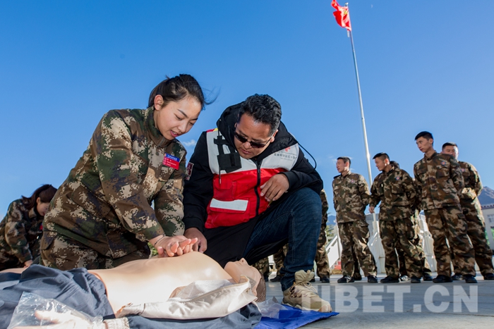 圖為(wei) 指戰員在西藏紅十字會(hui) 急救人員指導下開展緊急救護訓練。施福壽攝