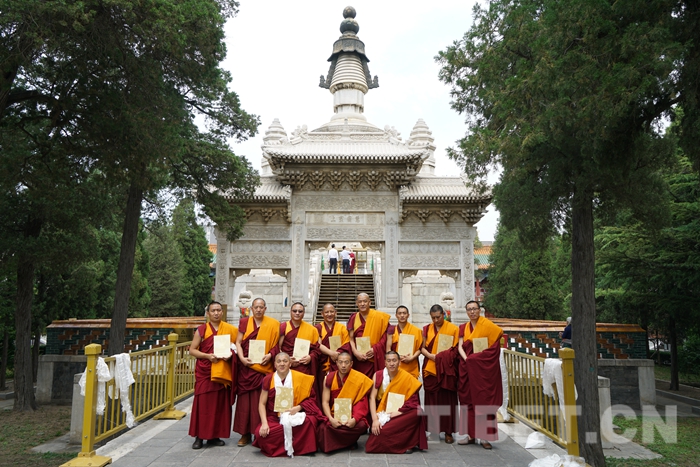 圖為(wei) 中國藏語係高級佛學院第十四屆格魯派“拓然巴”學銜獲得者在西黃寺清淨化城塔前合影留念。後排右三為(wei) 本文作者日巴。