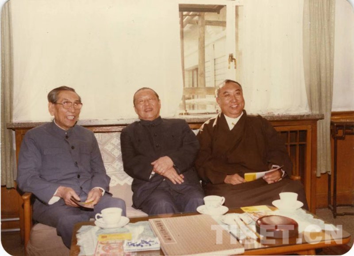 圖為(wei) 1987年初,十世班禪大師與(yu) 習(xi) 仲勳、阿沛•阿旺晉美商議援助西藏發展基金會(hui) 籌備事宜。