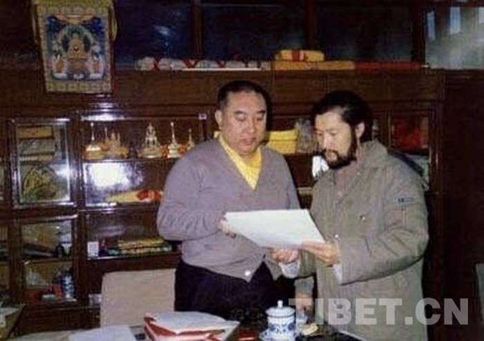 圖為(wei) 1987年初,十世班禪大師和畫家洛鬆向秋探討援助西藏發展基金會(hui) 徽標事宜。