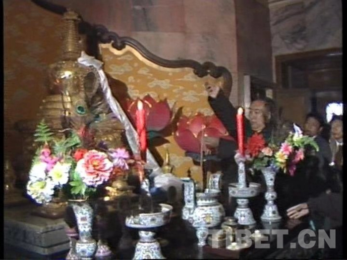 圖為(wei) 1987年4月,十世班禪大師和阿沛•阿旺晉美率領援助西藏發展基金會(hui) 籌備委員會(hui) 委員朝拜靈光寺佛牙舍利塔,並親(qin) 自敬獻哈達。
