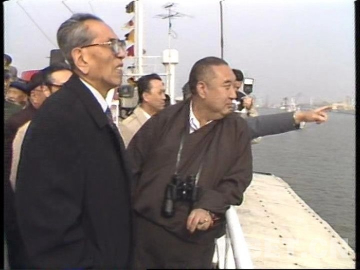 圖為(wei) 1987年4月19日,十世班禪大師和阿沛•阿旺晉美率領援助西藏發展基金會(hui) 籌備委員會(hui) 委員考察天津港。