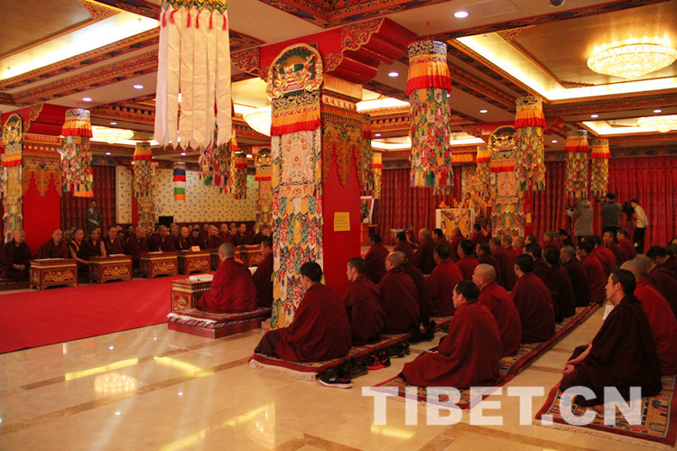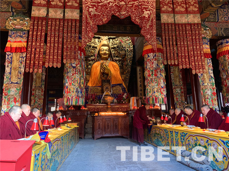 十一世班禪口念經文,百餘(yu) 位僧人身著戒衣,按順序分坐於(yu) 大殿兩(liang) 側(ce) ,跟隨大師虔誠詠誦《皈依發心》《文殊師利名讚》《十世班禪大師功德新祈禱詞》《回向祈禱詞》《十一世班禪大師常住世間法》《白度母讚》《釋教昌盛祈願》,以及《興(xing) 隆正法》《消除眾(zhong) 劫》《六時吉祥》等。