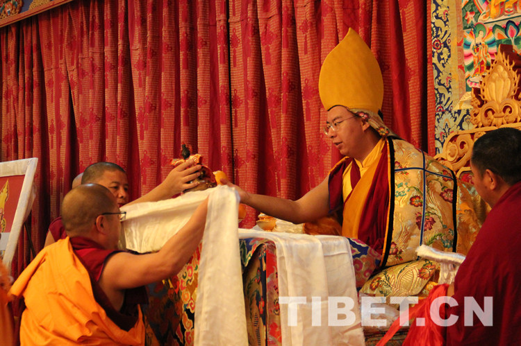 誦經結束後,土多申格副院長帶領3名經師代表和3名學員代表,向十一世班禪敬獻曼紮、佛像、佛塔、佛經,進行佛事禮拜。班禪微笑接過供奉,一一為(wei) 其摸頂賜福。
