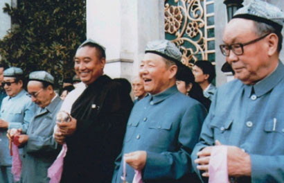 圖為(wei) 習(xi) 仲勳(左一)、十世班禪(中)、鄧穎超(右一)、參加中國藏語係高級佛學院成立大會(hui) 。圖片來源:人民日報