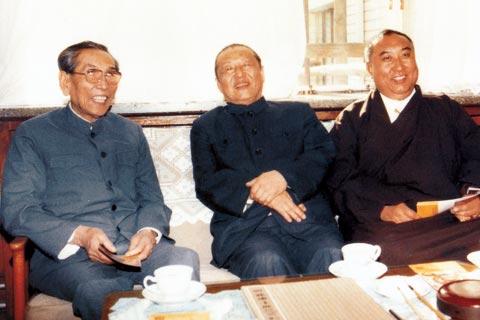 圖為(wei) 1986年4月,習(xi) 仲勳(中)與(yu) 十世班禪(右)、阿沛•阿旺晉美(左)在一起。圖片來源:新華網