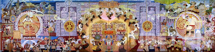 壁畫左麵主體(ti) 為(wei) 手舉(ju) 火把辭舊的西藏牧區婦女,她的四周環繞著吃古突、沐浴、背水、鳴槍、拋五穀、彈六弦、熱巴舞等活動場麵,以及手捧果實的門巴族、珞巴族人物。