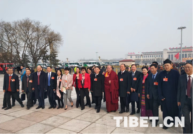 圖為(wei) 全國政協委員達紮•尕讓托布旦拉西降措與(yu) 其他全國政協委員一起入場