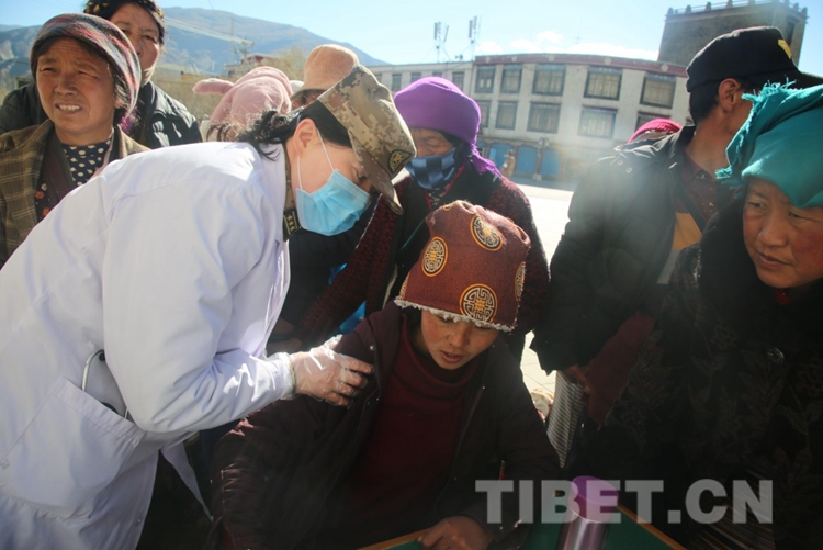 圖為(wei) 3月20日,解放軍(jun) 陸軍(jun) 第954醫院婦科副主任醫師寧萃秀為(wei) 瓊結縣群眾(zhong) 體(ti) 檢。