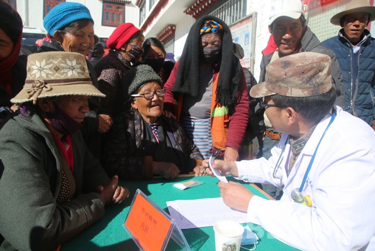 瓊結縣措傑村村民巴果高興(xing) 地說:“昨天駐村工作隊就通知市裏軍(jun) 醫院的醫療隊要來瓊結巡診,今天我和家人早早地吃過飯,不到九點鍾就來排隊啦。”