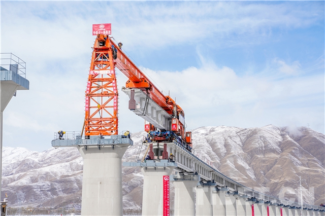 傑德秀Ⅰ號特大橋位於(yu) 西藏山南市貢嘎縣傑德秀古鎮旁,是拉林鐵路首座聲屏障特大橋,該橋設計全長1255米,共需架設38孔T梁,其中聲屏障梁18孔。