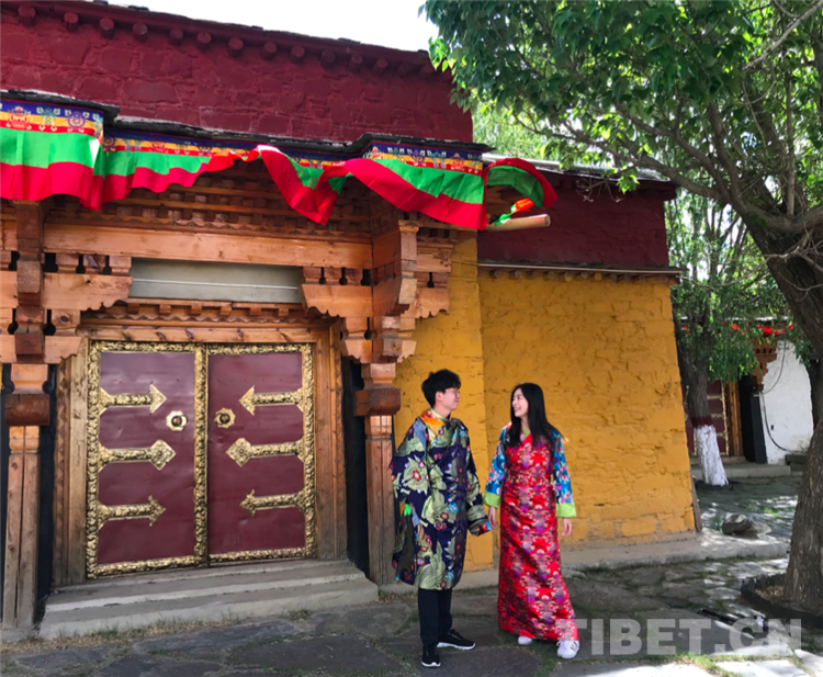 圖為(wei) 正在瓊結縣藏式建築前拍照留影的一對情侶(lv) 。