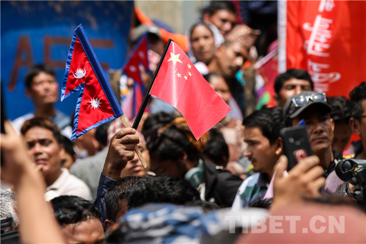 圖為(wei) 尼泊爾民眾(zhong) 揮舞中尼兩(liang) 國國旗,慶祝樟木口岸重新開放。攝影:何宇恒