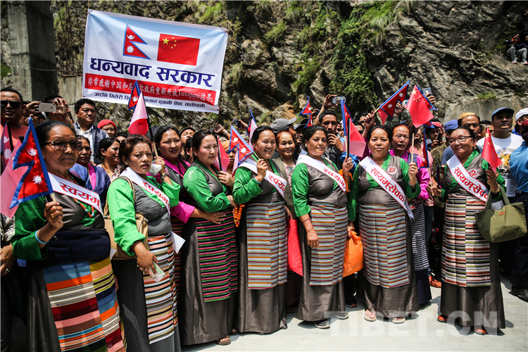 圖為(wei) 尼泊爾人民身著盛裝來到友誼橋尼方一側(ce) ,慶祝口岸恢複貨運通關(guan) 。攝影:何宇恒