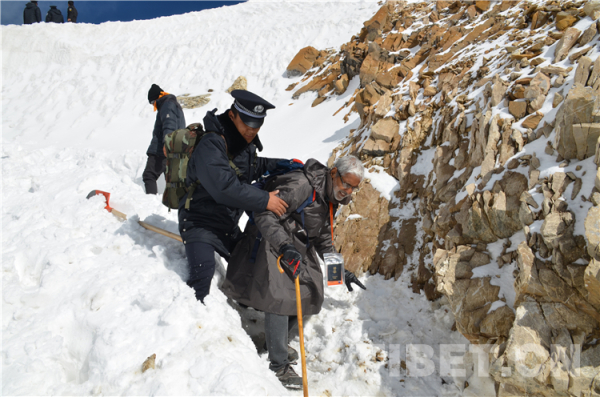 圖為(wei) 西藏阿裏地區普蘭(lan) 出入境邊防檢查站的移民管理警察攙扶印度官方香客通過危險路段