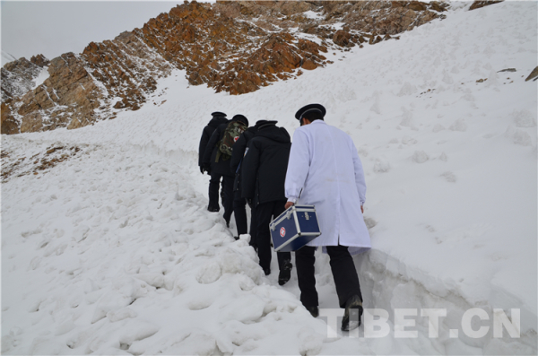 圖為(wei) 西藏阿裏地區普蘭(lan) 出入境邊防檢查站移民管理警察帶著查驗設備和醫療藥品,踏著積雪前往強拉山口執勤