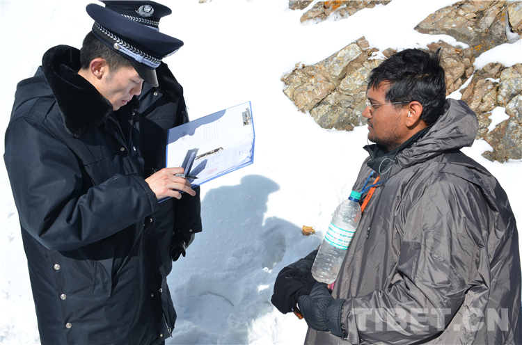 強拉山口氣候條件惡劣,沒有任何建築物,移民警察們(men) 冒著風雪,對印度官方香客逐一細致開展人證對照工作,確保人員入境安全有序。