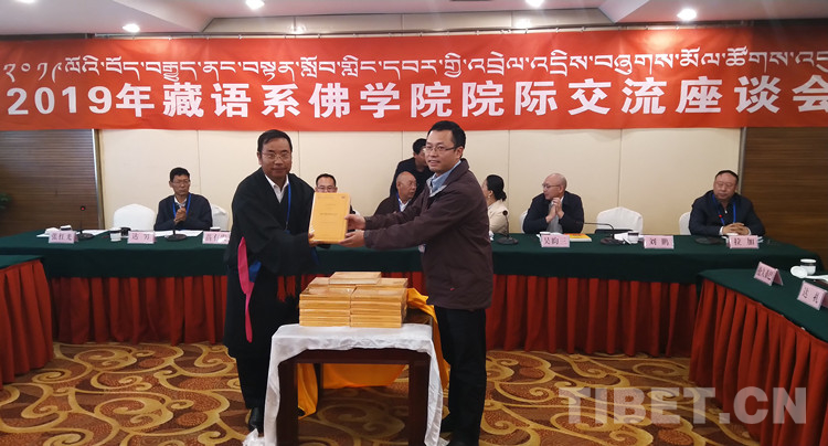 圖為(wei) 中國藏語係高級佛學院向雲(yun) 南藏語係佛學院贈送三級學銜教材