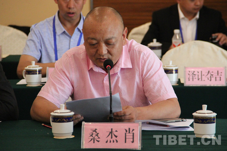 圖為(wei) 中國藏語係高級佛學院教務處副處長桑傑肖介紹本學院高級學銜班教學大綱編寫(xie) 情況
