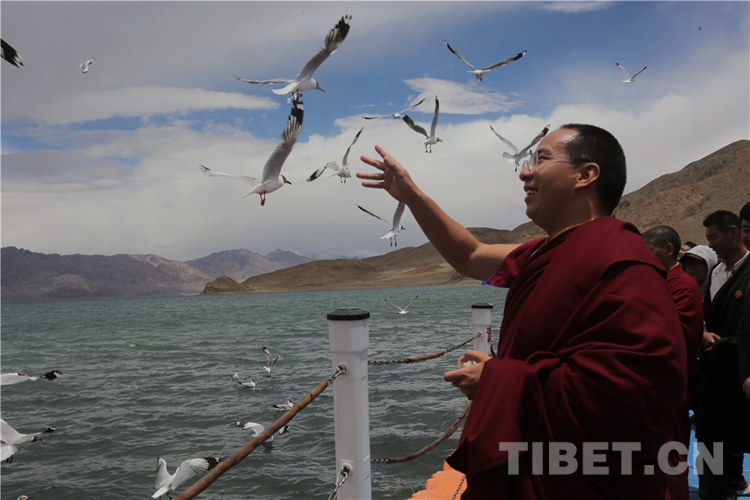 7月26日,十一世班禪觀覽班公湖,考察生態保護情況。置身於(yu) 藍天綠水和湖光山色中,觀看鳥兒(er) 展翅飛翔和低空盤旋,聆聽美妙的鳥鳴聲,讓人感受到人與(yu) 自然、與(yu) 動物和諧相處的溫馨場景。