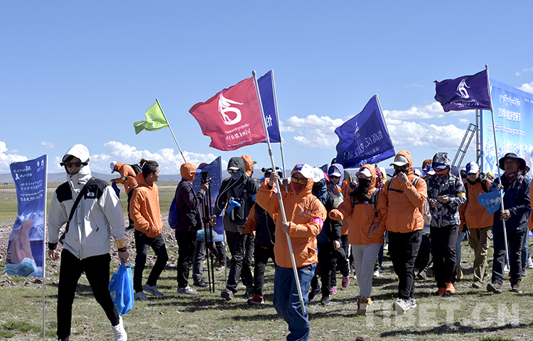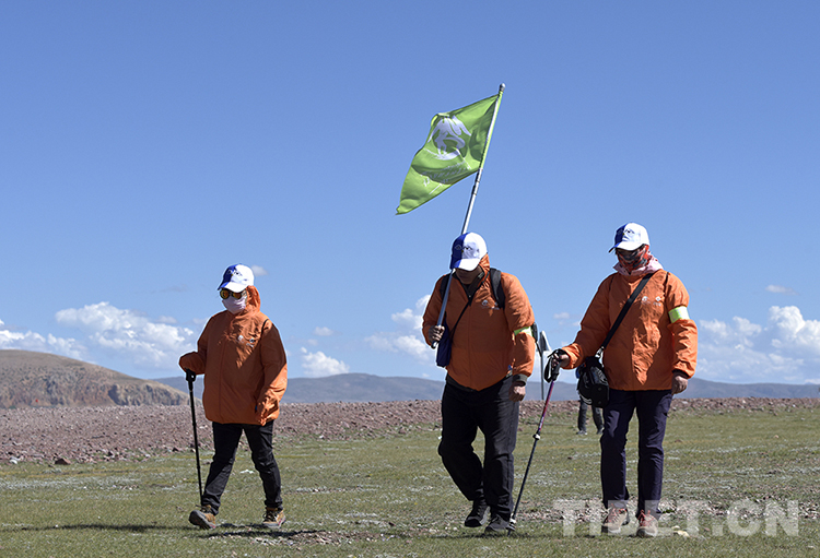 上午11時10分許,參加“攬勝天湖”體(ti) 驗組主題徒步的隊員們(men) 在集結地,納木錯景區三岔路口準時出發。隊員們(men) 頭戴白色的防曬帽、身著橙色的防曬服、後背藍色的能量補充包三三兩(liang) 兩(liang) 行進在湖畔公路上。