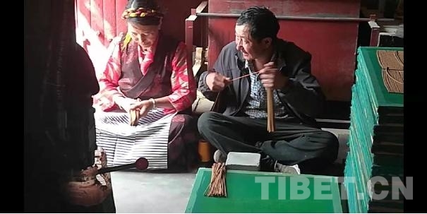 次仁多傑老人的弟弟和女主人正在捆藏香