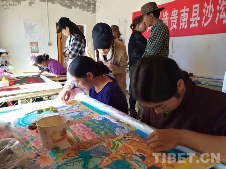 圖為(wei) 導演組一行參觀貴南縣沙溝鄉(xiang) 德茫村藏繡生產(chan) 基地