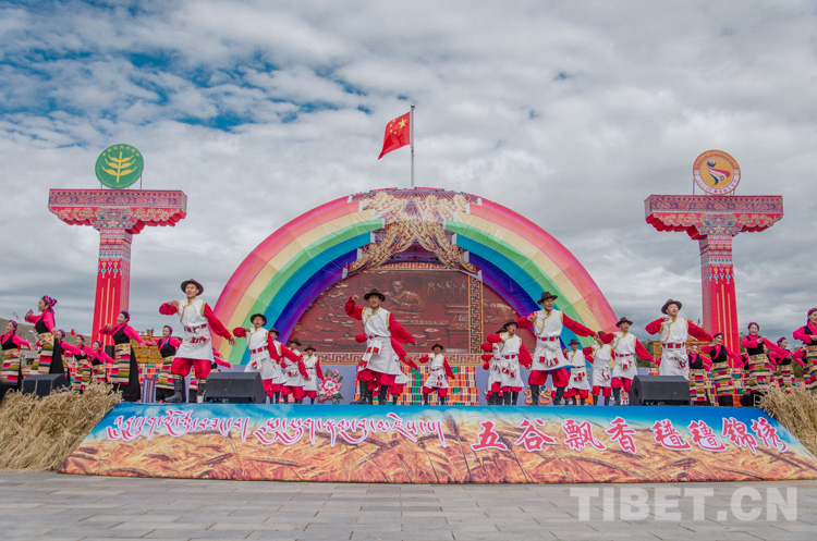 開幕式在紮囊縣群眾(zhong) 代表表演的情景歌舞《豐(feng) 收》中拉開序幕。除中間的主舞台外,傳(chuan) 統秋收活動和氆氌紡織技藝被搬上了左右兩(liang) 側(ce) 的副舞台,極具特色的表演方式將紮囊縣的特色文化淋漓盡致地展現給了每一位觀眾(zhong) 。