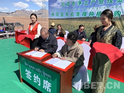 圖為(wei) 拉薩淨土產(chan) 業(ye) 集團在林周縣舉(ju) 行有機青稞種植收購示範項目簽約啟動儀(yi) 式 攝影: 賈華加