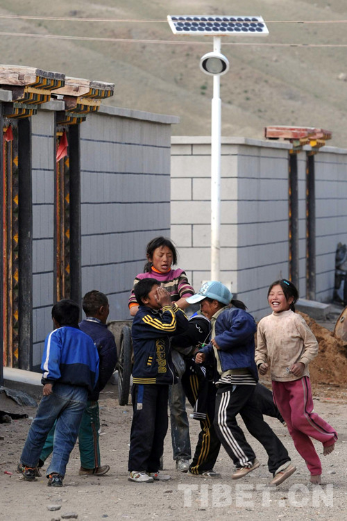 圖為(wei) 暑假裏,嘎措鄉(xiang) 兒(er) 童在房前玩遊戲(2009年8月1日) 攝影:唐召明