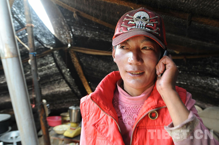 圖為(wei) 嘎措鄉(xiang) 牧女頓珠卓瑪在夏季放牧點的帳篷裏使用手機與(yu) 家人通話報平安(2009年8月1日) 攝影:唐召明
