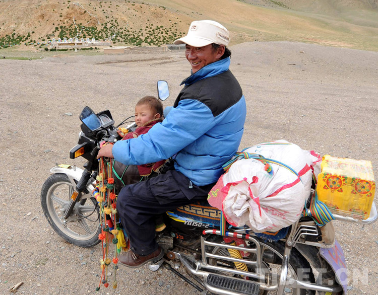 圖為(wei) 一位牧民騎摩托車帶著孩子串門。目前,這個(ge) 鄉(xiang) 的90多戶牧民家家戶戶都有了摩托車(2009年8月1日) 攝影:唐召明