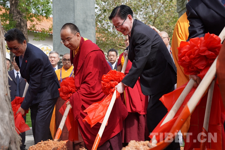 圖為(wei) 與(yu) 會(hui) 領導和三國佛教界代表共植和平樹 攝影:王淑