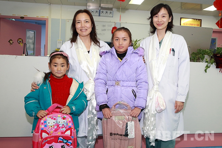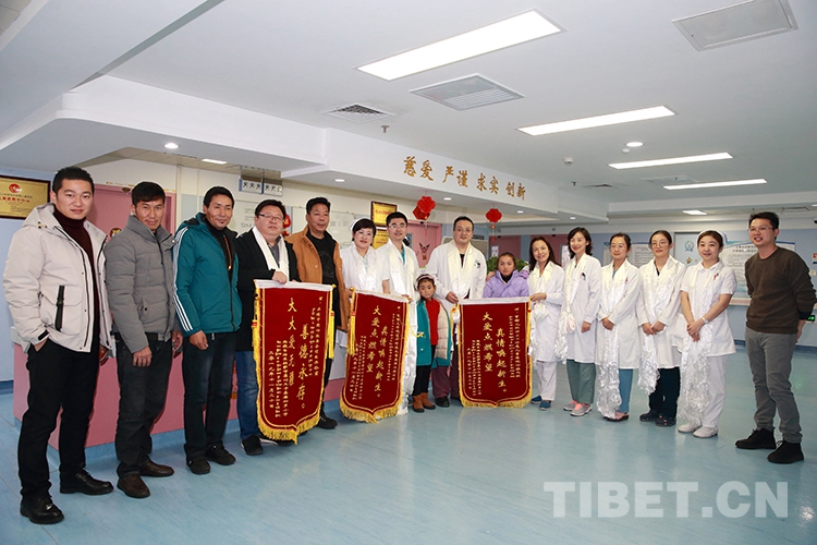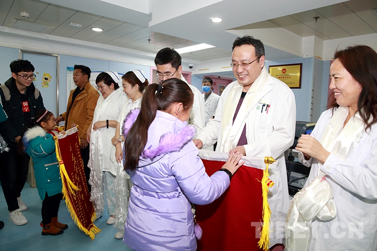 返鄉(xiang) 前,洛桑曲宗和次旦德吉在親(qin) 屬和小學校長的帶領下來到兒(er) 研所,向醫護人員和共鑄中國心組委會(hui) 的工作人員獻上了哈達和錦旗,表達感激之情。醫護人員也向兩(liang) 個(ge) 孩子贈送了書(shu) 包等文具,鼓勵他們(men) 回校後好好學習(xi) 。