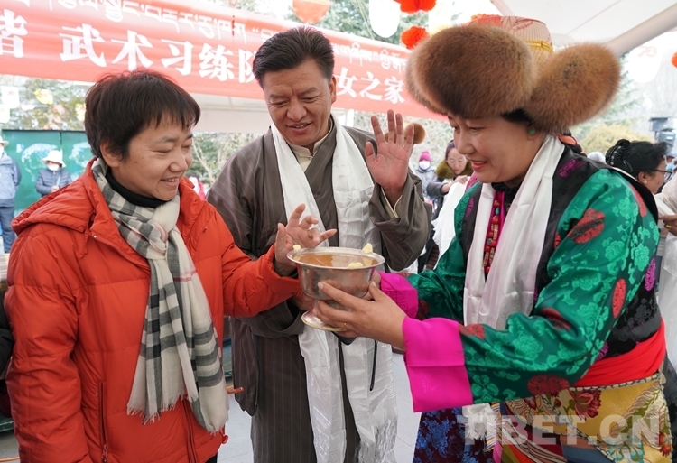 圖為(wei) 西藏自治區婦聯向宗角祿康公園朗瑪堆諧和武術習(xi) 練隊授“婦女之家”牌匾 攝影:王淑