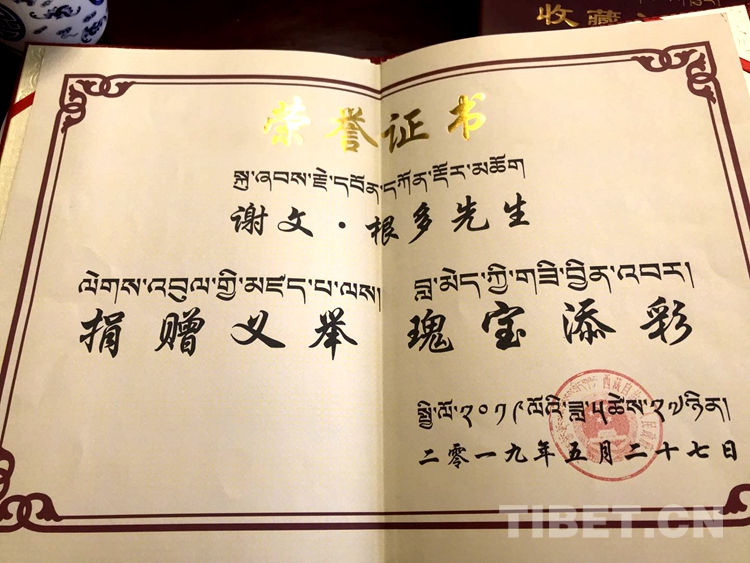 圖為(wei) 2019年5月,謝文•根多獲得的榮譽證書(shu) 攝影:王媛媛